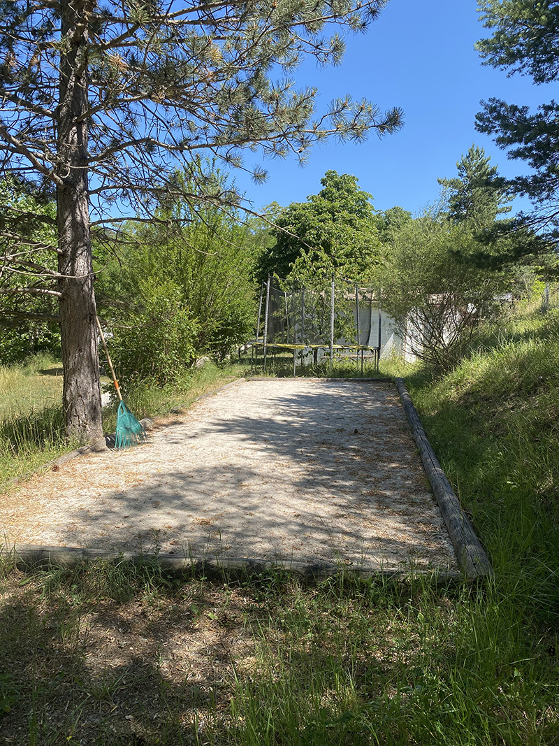 De trampoline staat naast het petanqueterrein en is toegankelijk voor kinderen tot 10 jaar.